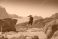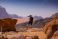 • Wadi Rum w Jordanii. Mężczyzna stojący na skale fotografujący pustynię.