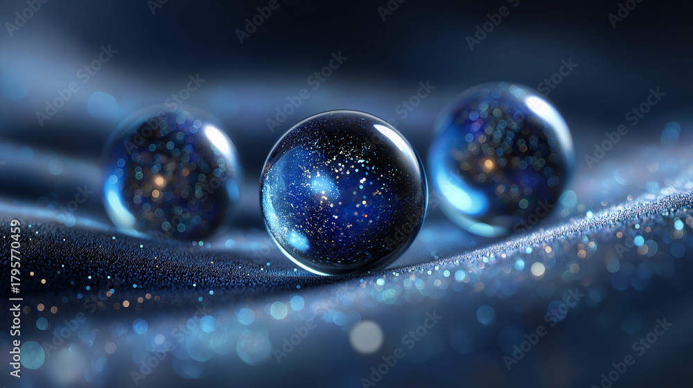 • Drei mystische Glaskugeln mit kosmischen Strukturen schweben mit Lichteffekten im Weltraum