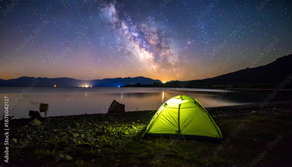 Obrazy Kosmos - Leuchtendes Zelt unter Sternenhimmel mit Milchstraße in den Bergen bei Nacht #1870042127
