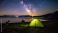 • Leuchtendes Zelt unter Sternenhimmel mit Milchstraße in den Bergen bei Nacht