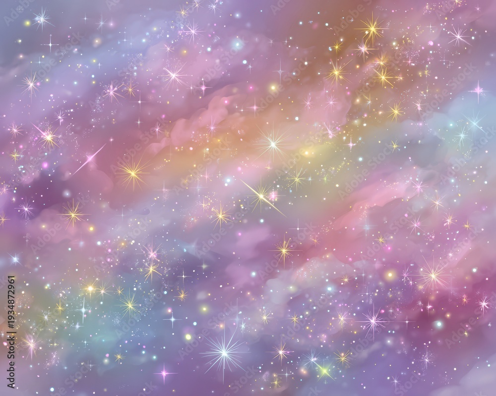 • Magiczny, pastelowy kosmos z brokatowymi gwiazdami, abstrakcyjne tło konstelacji w kolorach tęczy.