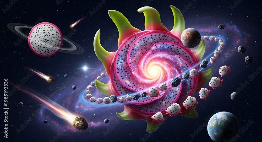 • buah naga galaksi tata surya planet asteroid luar angkasa kosmos konsep imajinasi surealis fiksi sains eksplorasi alam semesta eksotis magis