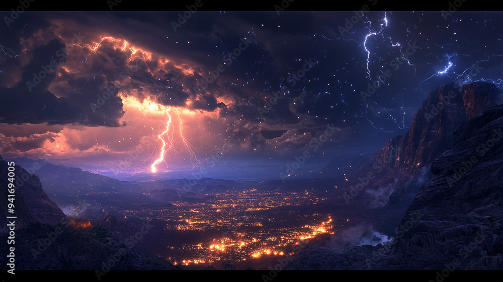 • Oszałamiający widok nocnego krajobrazu, oświetlony przez potężny piorun, który uwydatnia odległe światła miasta i okoliczny teren.