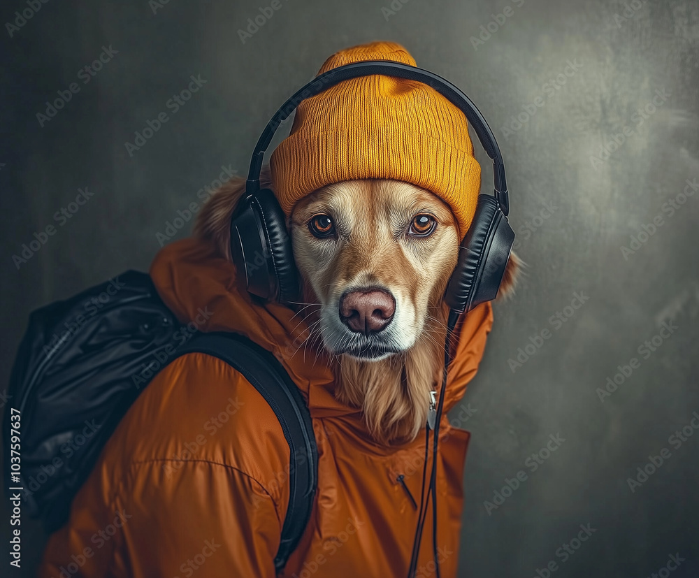 Muzyka - Pies w słuchawkach i żółtej czapce na głowie - 144 #1037597637