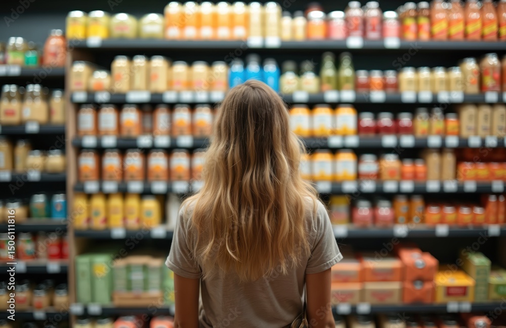 • Back view young woman selects groceries in supermarket. Female shopper considers food choices. Healthy eating, lifestyle concept. Grocery store shelves with various food products. Shopping,