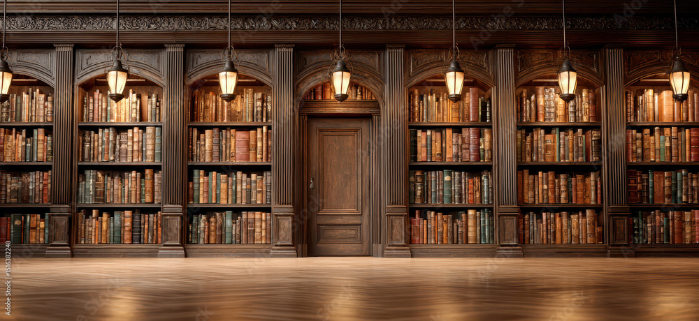 Przestrzeń - Large wooden library wall with bookshelves filled with old books #1516382248