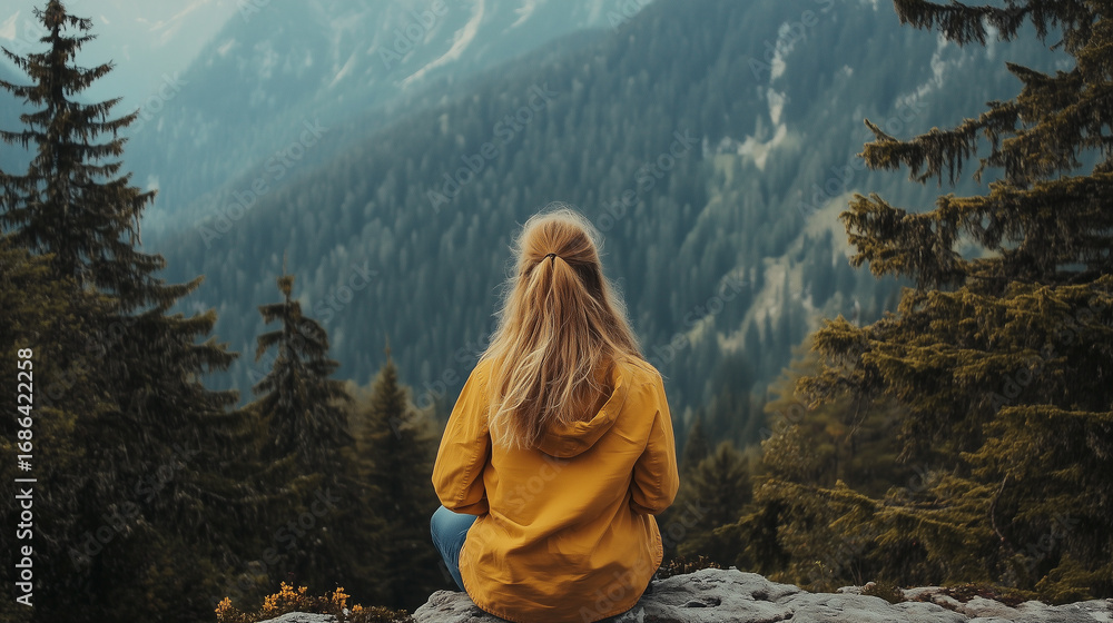 • woman traveler looking at mountains and forest view