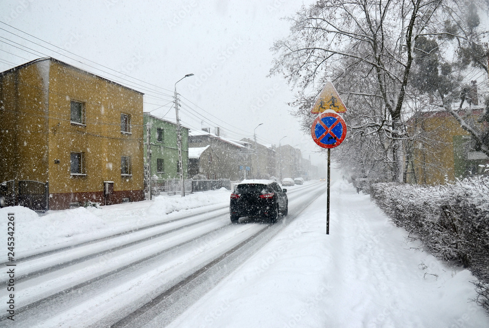 Auta - Nieodśnieżona droga, trudne warunki drogowe, opady śniegu w mieście #245342261