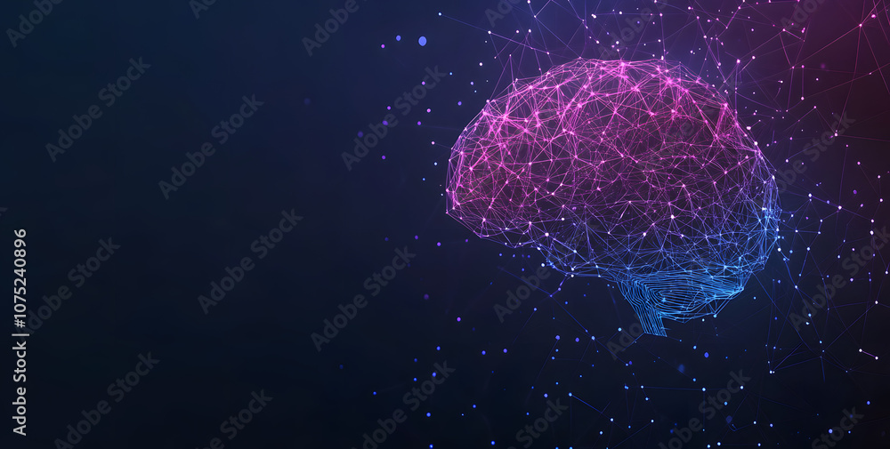 • A digital abstract background with glowing blue and purple connections forms the shape of an AI brain on a dark gradient, ideal for tech presentations and social network banners.