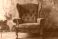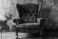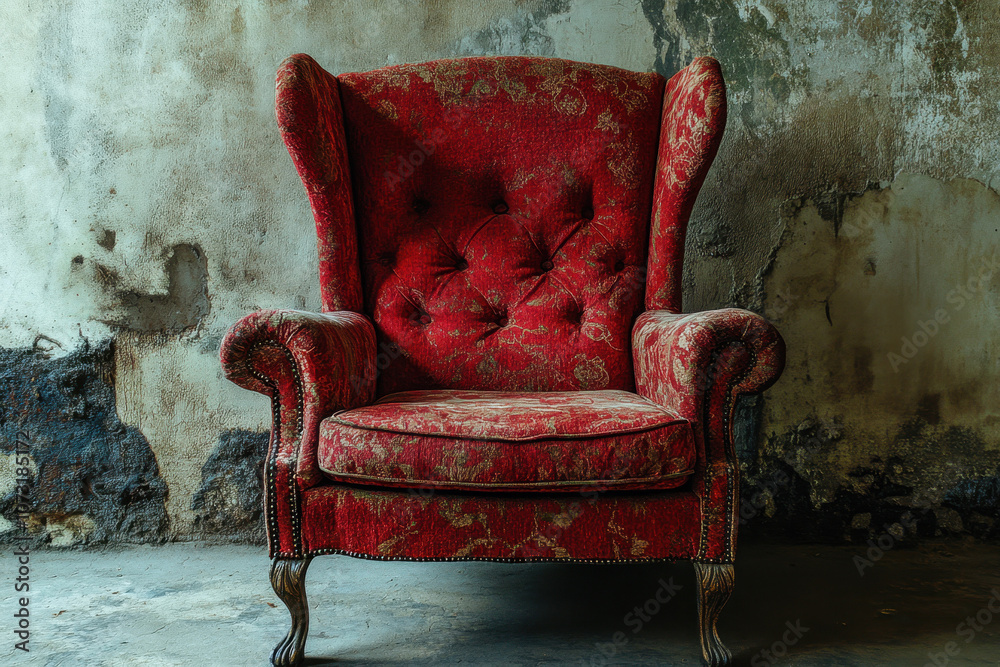 • Vintage red armchair with ornate patterns against an aged, textured wall, exuding a sense of history and timeless elegance.