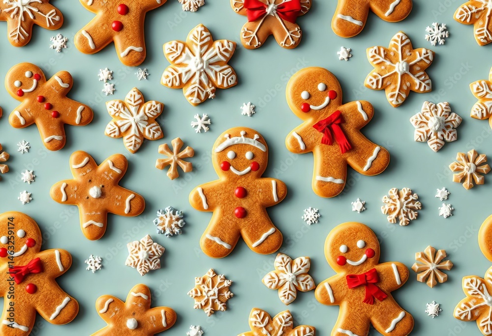• Seamless winter Christmas pattern featuring gingerbread figures and snowflake cookies, texture, element