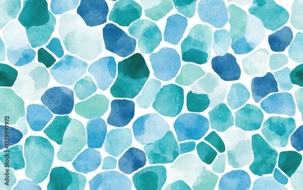 • Abstract watercolor pattern of textured, interlocking blue and teal stones