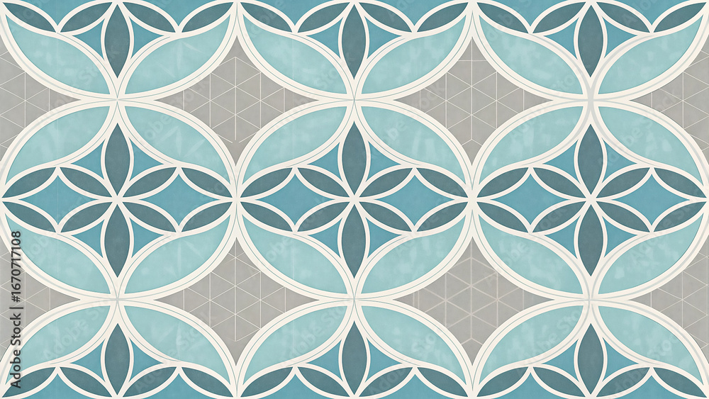 • Seamless geometric pattern with interlocking oval shapes and floral elements in blue and grey