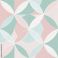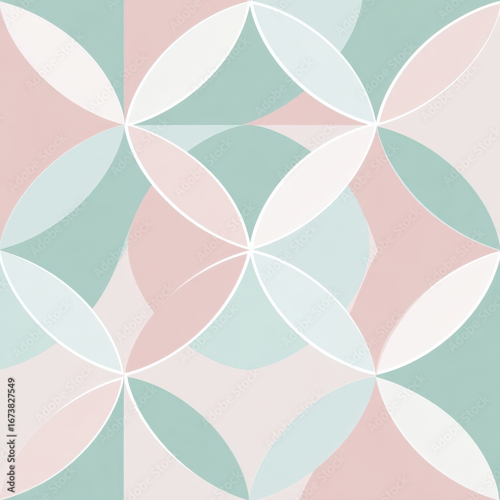 • Abstract geometric pattern with overlapping circles in pastel pink, mint green, and white, creating a soft, modern, and elegant design
