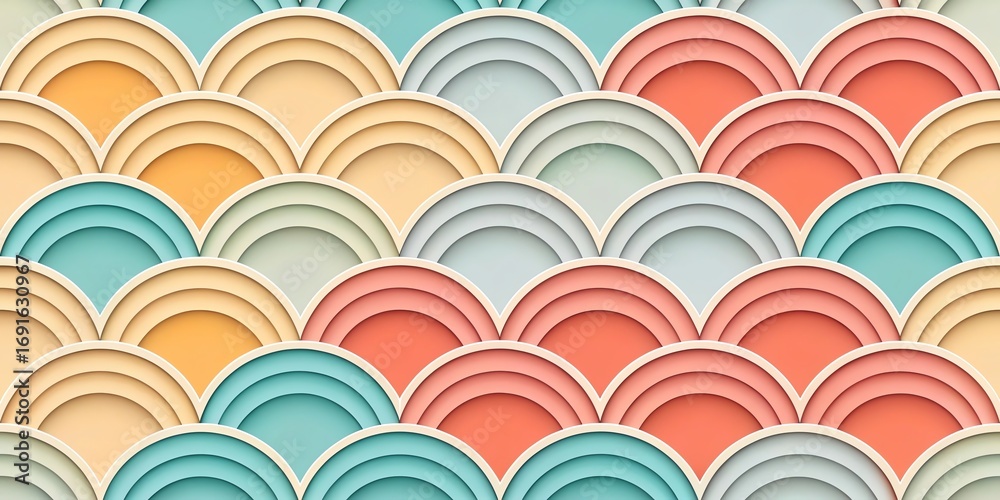 • Art deco inspired seamless pattern with layered scallops in pastel shades of peach teal and yellow