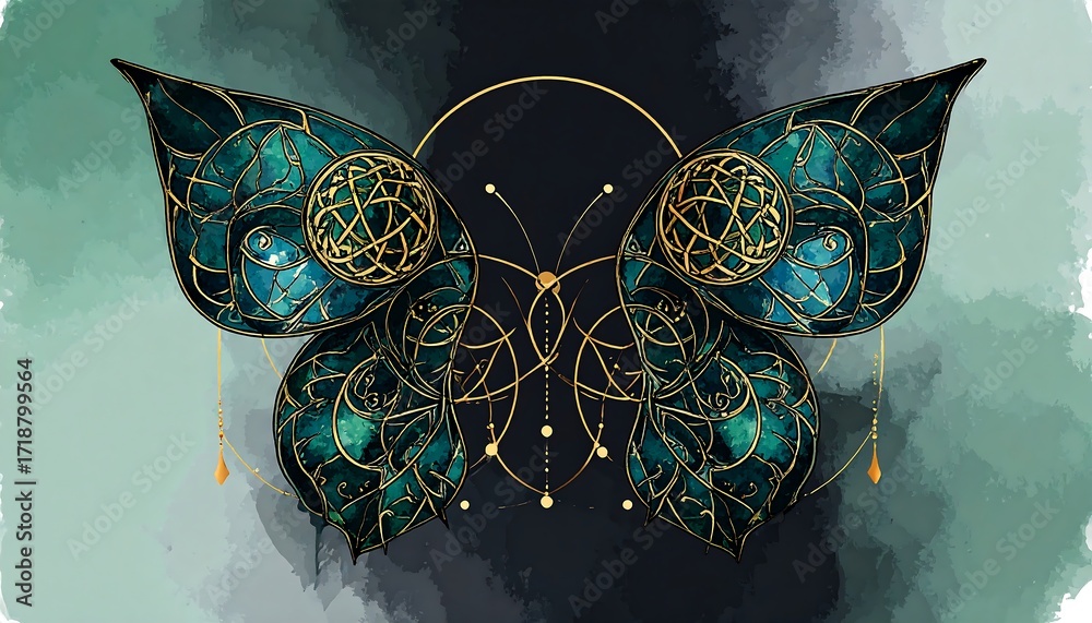 • Ornate jeweled butterfly wings with geometric patterns on a watercolor background