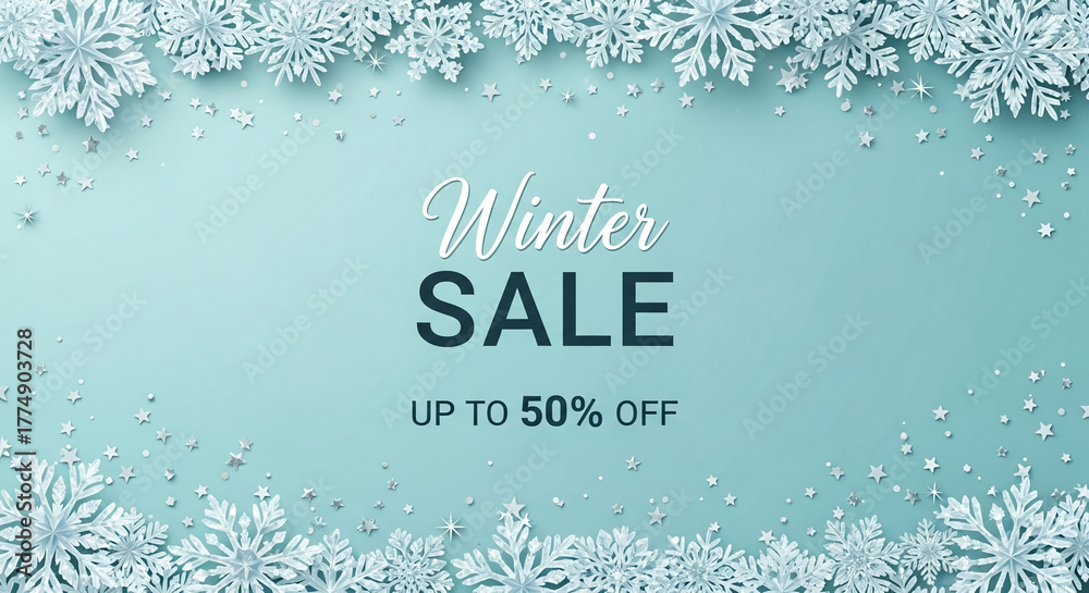 • Light blue background with snowflake and star frame, suggesting winter celebration, festive season, promotional banner, or holiday greetings