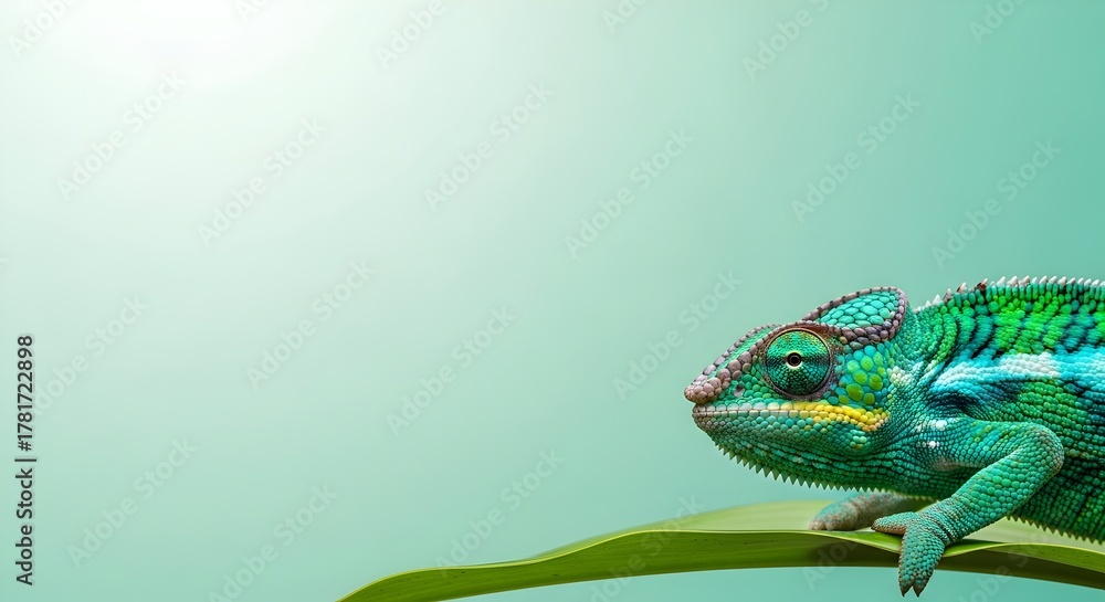 Obrazy Turkus - Captivating Chameleon on Leaf with Teal Background Showing Intricate Details and Vibrant Colors #1781722898
