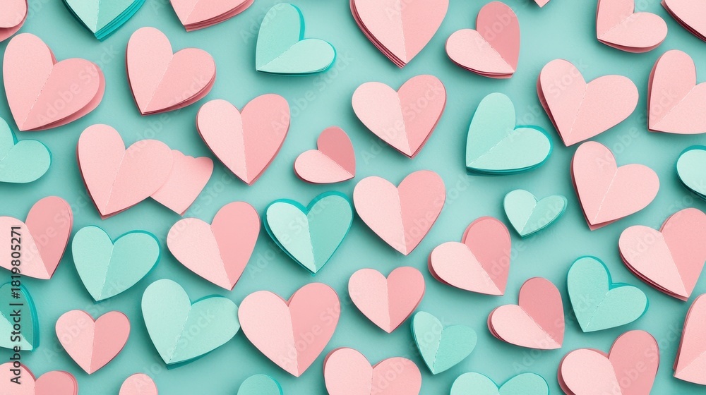 • Seamless pattern of folded paper hearts in pink and aqua on a pastel blue background