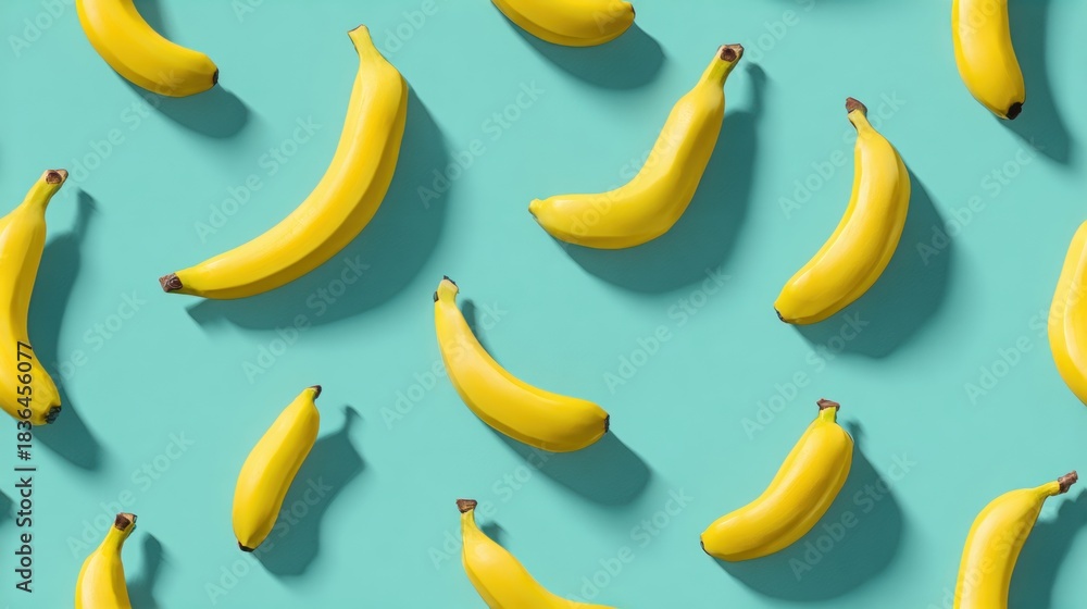 • A vibrant, eye-catching banana pattern on a refreshing teal background.