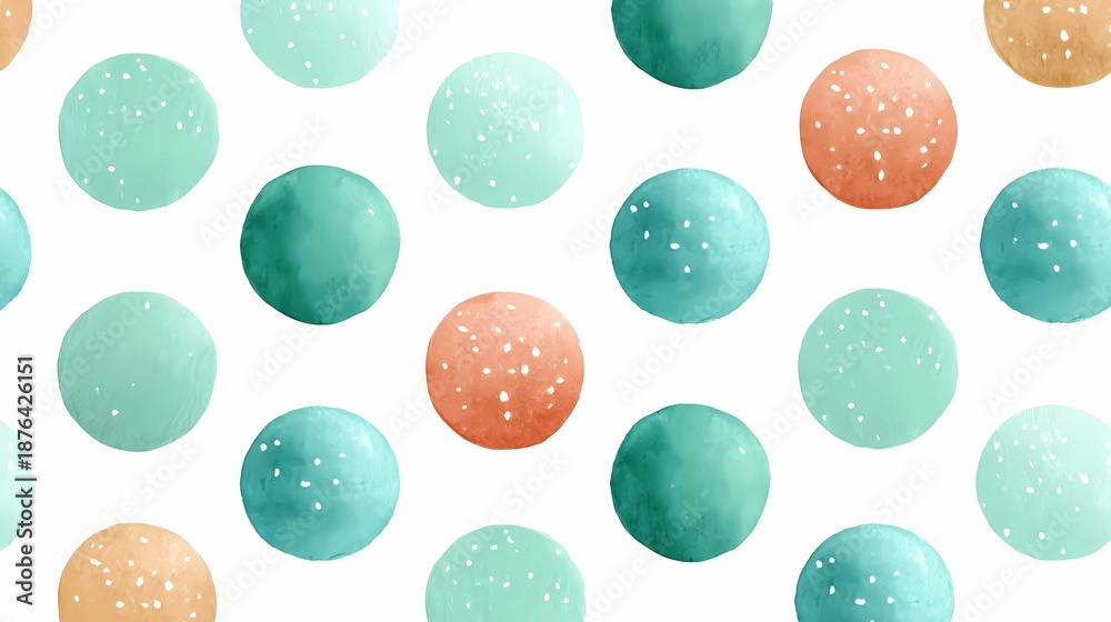 • Watercolor circles pattern with teal turquoise coral and peach tones on white background