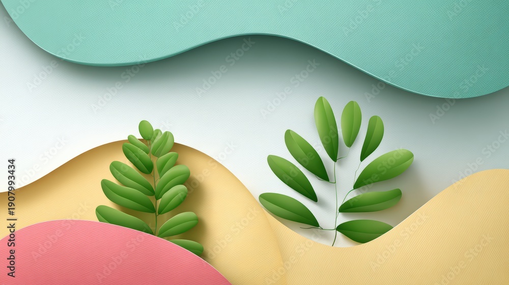 • Tropical abstract background with palm frond patterns and fluid strokes, in dusty turquoise, blush pink, and warm sand tones, flat vector style