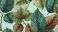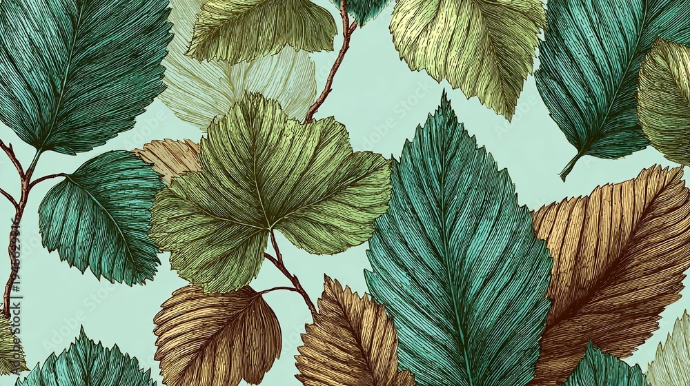 • Vintage botanical leaf pattern with green and brown leaves on mint background