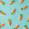 • Easter pattern made with carrots on bright blue background. Creative minimal holiday concept. Flat lay.
