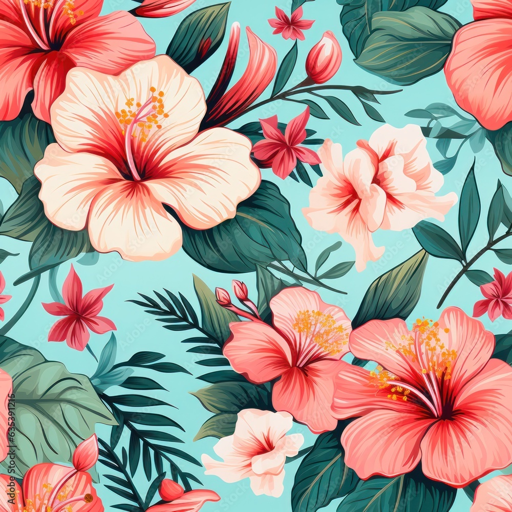 Obrazy Turkus - seamless hibiscus flower background. Hawaiian shirt fabric pattern #635391215