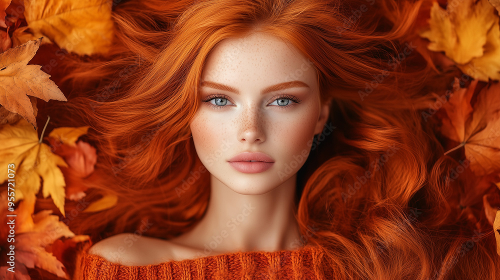 Obrazy Jesień - Piękna kobieta o rudych włosach symbolizująca jesień, na tle w odcieniach typowych dla tej pory... #955721073