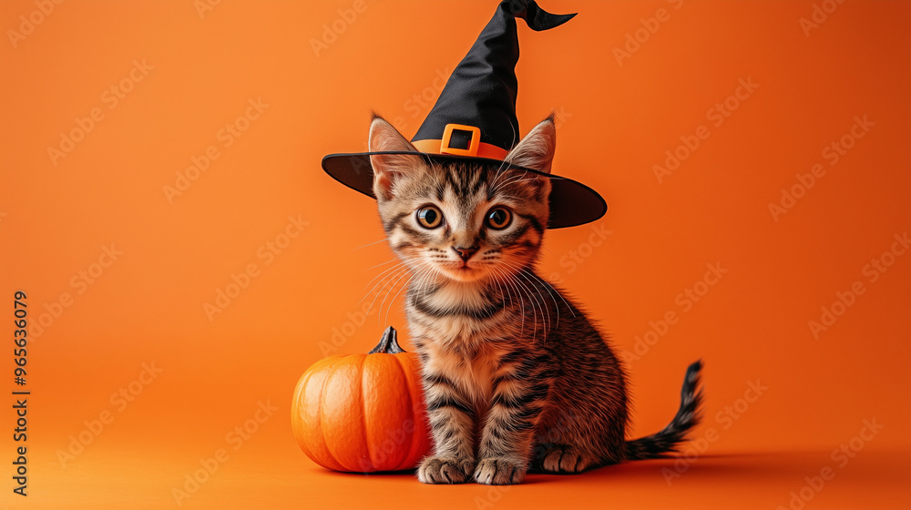 • Halloween - mały kociak siedzi w kapeluszu czarownicy obok dyni na pomarańczowym tle.