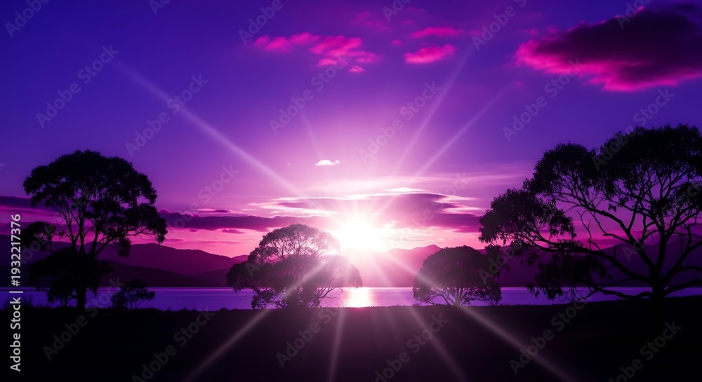Obrazy Chabrowy - Intense purple sunset illuminates a tranquil waterscape bordered by silhouetted trees and distant... #1932217376