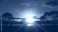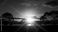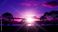 • Intense purple sunset illuminates a tranquil waterscape bordered by silhouetted trees and distant hills
