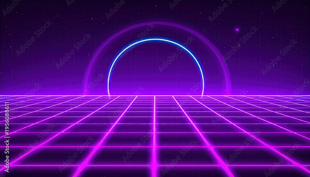 • Retro neon grid perspective with circle background, space, and a potential gaming atmosphere