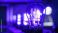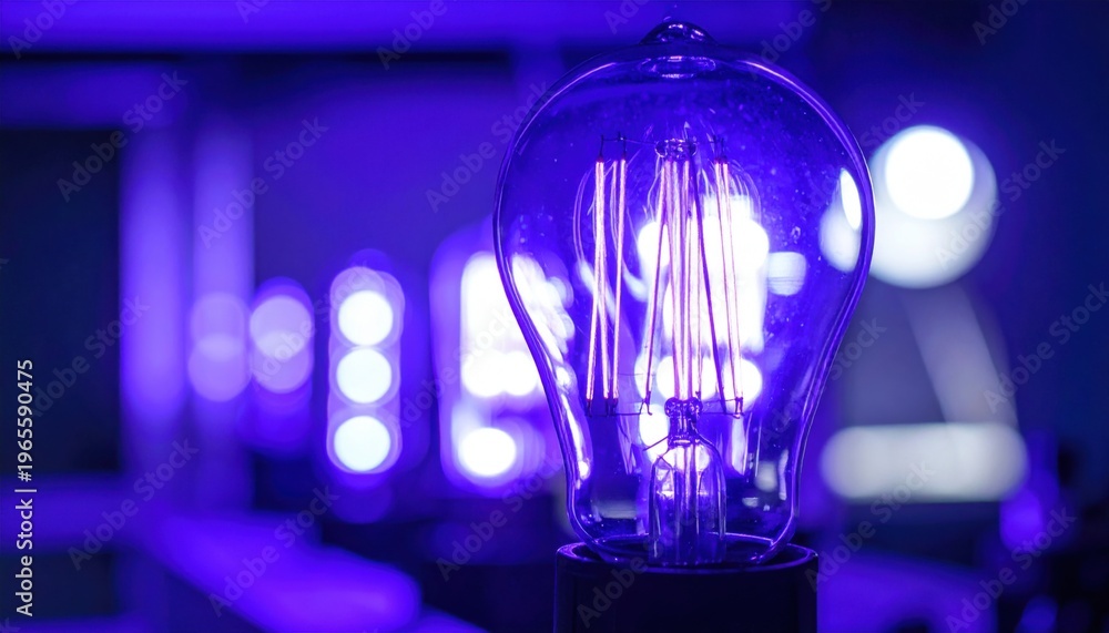 • A modern Edison-style argon gas-filled light bulb, showcasing its intricate filaments and emitting a captivating violet glow in a blurred, ambient setting.
