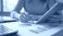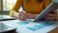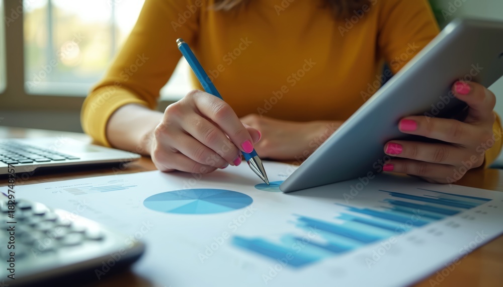 • Woman reviews financial charts on tablet and paper. She uses pen to point at data, planning budget with laptop computer nearby. Person analyzes stats for better investment results.