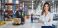 • Happy woman warehouse manager standing near cardboard boxes background. Logistic commercial storage retail goods supply. Storehouse distribution, industrial merchandise and delivery. Banner