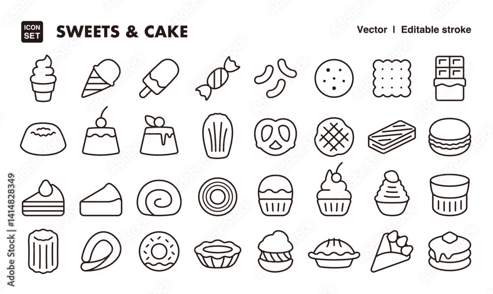 Obrazy Słodycze - Sweets and cake line icon set. Vector editable stroke icon. #1414828349