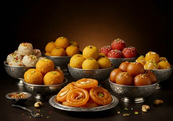Obraz Assorted basket of Diwali sweets like barfi, laddoo, and gulab jamun, flanked by lit candles on an intricately carved wooden tableDopasuj i kup