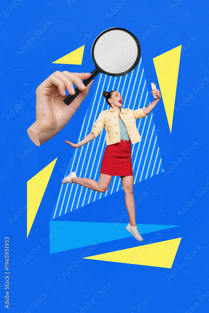 • Banner vertical photo trend image collage of excited girl magnifier glass investigating employment search vacancy candidate zoom