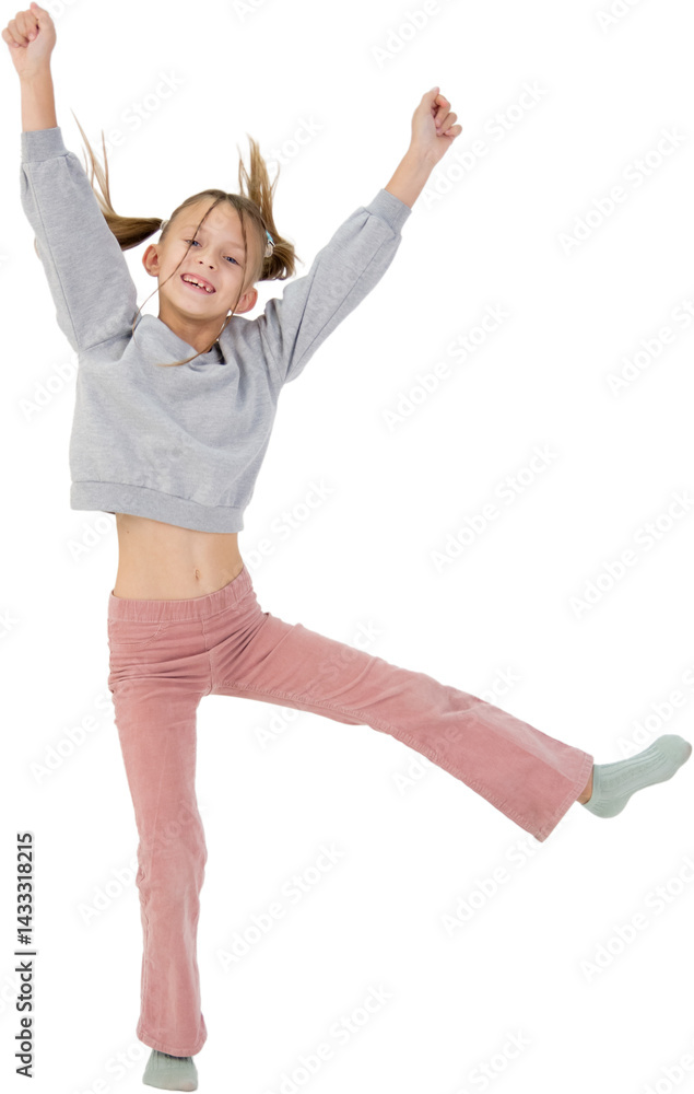 • An Energetic and Happy Young Girl Jumping with Arms Up in the Air On White Background