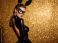 • Beautiful woman in a black latex bunny costume with mask posing against golden glitter background for halloween party