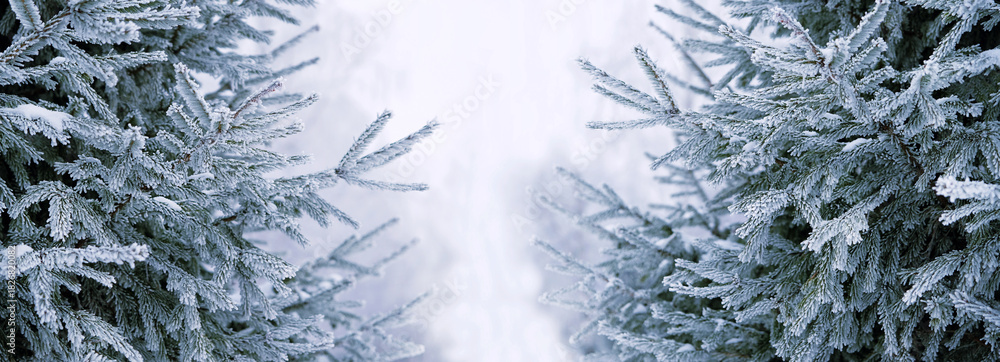 • Beautiful winter background with snowy fir trees. Symbol of festive winter season, Christmas, New Year holidays. cold weather. rime covered needles fir tree branches. element for design. banner.