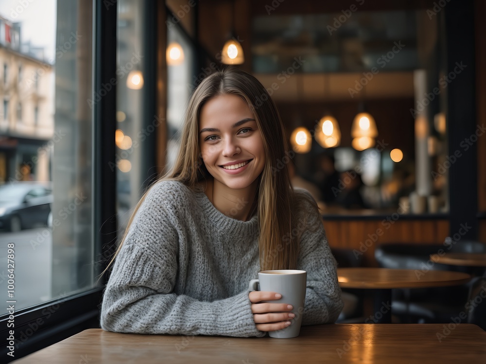 Obrazy Kawa - Ładna blond dziewczyna siedząca w szarym swetrze z kubkiem kawy, siedzi w przy oknie w restauracji #1006427898