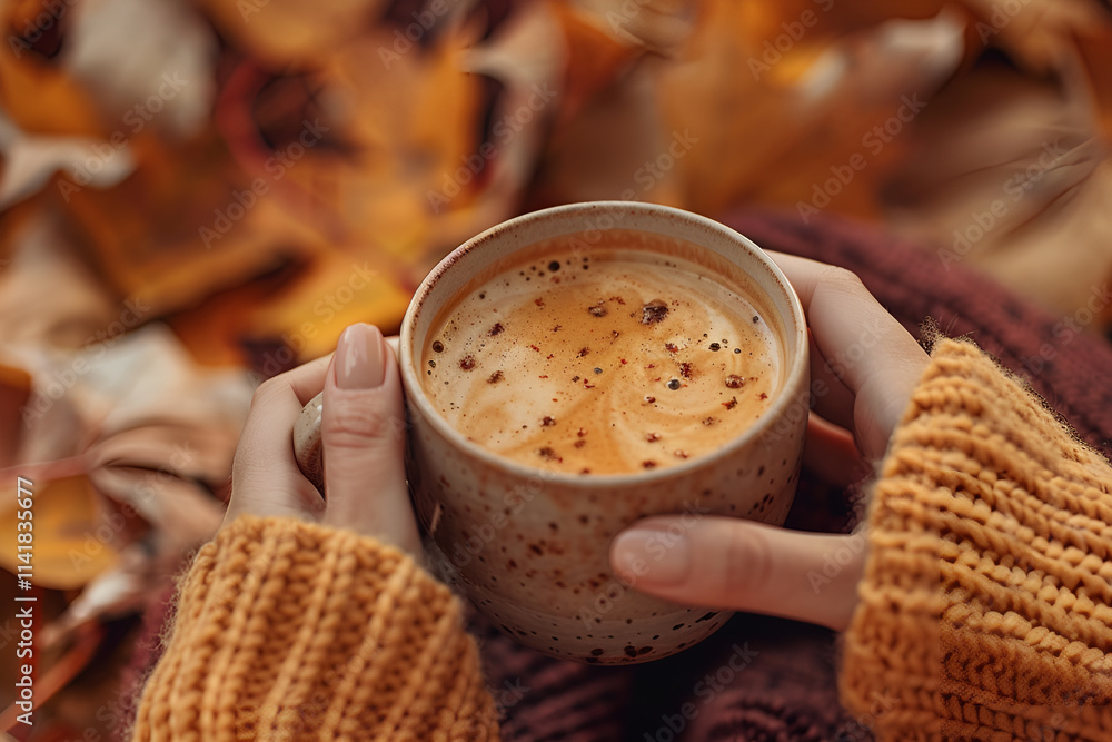 • Dłonie trzymające ceramiczny kubek z aromatycznym latte, ozdobionym mleczną pianką i posypką, na tle jesiennych liści.