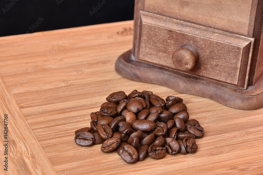 Obrazy Kawa - Kawa i młynek na stole #142847761
