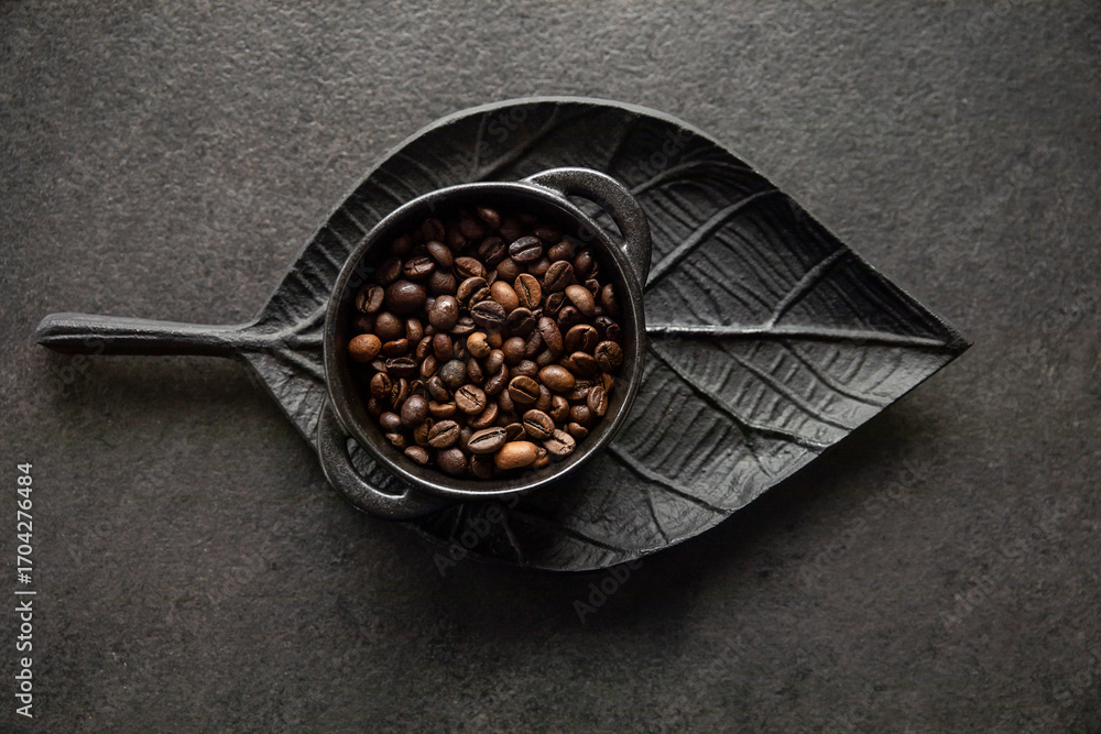 Obrazy Kawa - Ziarna kawy w miseczce na tle ozdobnej tacy w kształcie liścia Coffee beans in a bowl on a... #1704276484