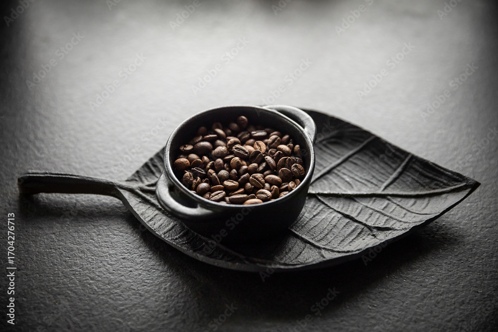Obrazy Kawa - Ziarna kawy w miseczce na tle ozdobnej tacy w kształcie liścia Coffee beans in a bowl on a... #1704276713