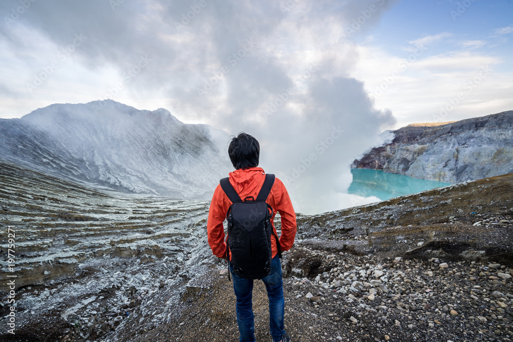 Obrazy Kawa - Young travler looking crater blue lake at Kawah Ijen, Indonesia #197759271