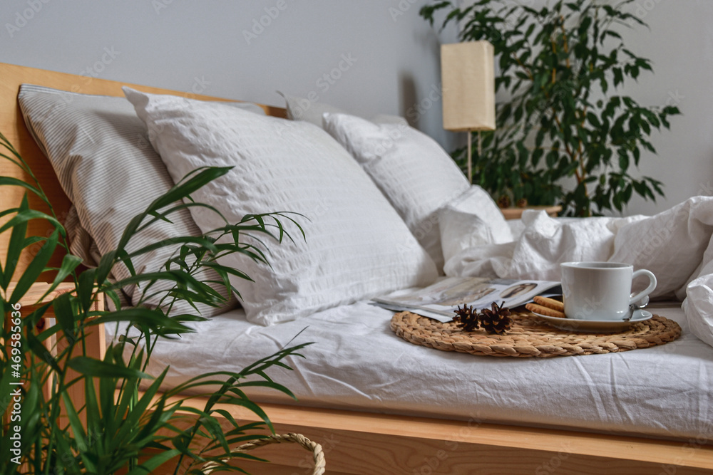 • Przytulna sypialnia w stylu boho, biała pościel, czarna kawa o poranku w łóżku, minimalistyczne wnętrze, klimatycznie.